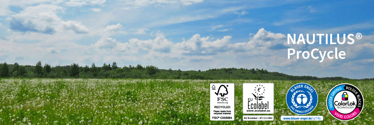 Das Recyclingpapier Nautilus® ProCycle ermöglicht einen nachhaltigen Beitrag ohne Kompromisse bei der Druckqualität. Das FSC, Blauer Engel und Cradle to Cradle zertifizierte Papier, hergestellt aus 100% Altpapier, zeichnet sich durch seinen hohen Weissgrad CIE 135 aus, der Ihr Druckbild trotz Recyclingpapier nicht gräulich aussehen lässt.